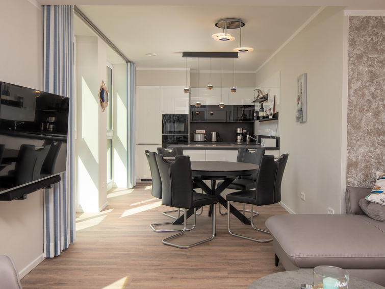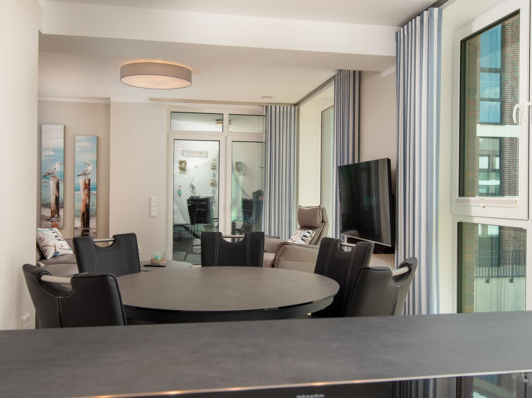 4-Zimmer-Wohnung 96 m2 im 1. Stock. Sehr komfortabel und luxuriös eingerichtet: Wohn-/Esszimmer mit Kabel-TV (Flachbildschirm), Stereoanlage. Ausgang zum Balkon. 2 Doppelzimmer, jedes Zimmer mit Kabel-TV (Flachbildschirm), elektrischem Rollladen. 1 Zimmer mit 1 Bett, Kabel-TV und elektrischem Rollladen. Offene Küche (Backofen, Geschirrspüler, 4 Induktionskochplatten, Toaster, Wasserkocher, Mikrowelle, Tiefkühler, elektrische Kaffeemaschine). 2 Duschen/WC. Fussbodenheizung. Balkon. Balkonmöbel, Abstellkammer. Herrliche Sicht auf den Kanal. Zur Verfügung: Waschmaschine, Wäschetrockner, Bügeleisen, Kinderhochstuhl, Haartrockner, Wickelkommode. Internet (Wireless LAN). Bitte beachten: Nichtraucher-Unterkunft. Rauchmelder. Der Balkon mit Aussicht auf das Norder Tief verfügt über eine Markise.