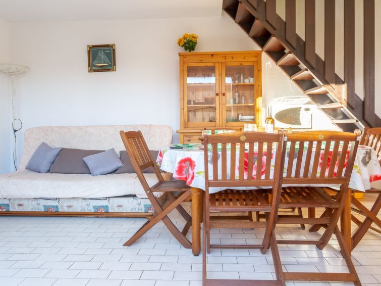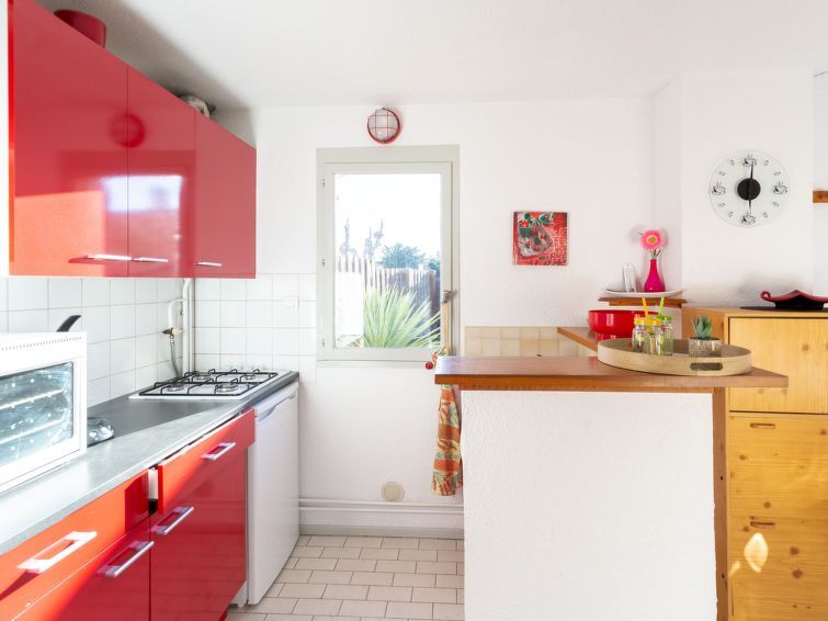 Maison mitoyenne 3 pièces 40 m2 sur 2 niveaux. Séjour/salle à manger avec 1 divan-lit double (140 cm, longueur 190 cm), TV (écran plat). Sortie sur la terrasse. Cuisine ouverte (4 plaques de cuisson, four, bouilloire électrique, micro-ondes, congélateur, cafetière électrique). À l'étage supérieur: 1 chambre avec 1 x 2 lits superposés (90 cm, longueur 190 cm). 1 chambre avec 1 grand-lit (140 cm, longueur 190 cm). Salle de bains, WC séparé. Grande terrasse 30 m2, petit jardinet 10 m2. Meubles de terrasse. A disposition: lave-linge. Internet (Connexion WIFI, en sus). Place de parking No 68. Veuillez noter: adapté(e) aux familles. Maison non-fumeur. Détecteur de fumée. Annonce d'un particulier (art 155, IV du CGI). FR7450.15.4