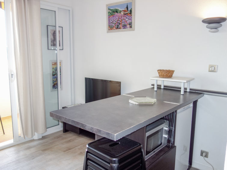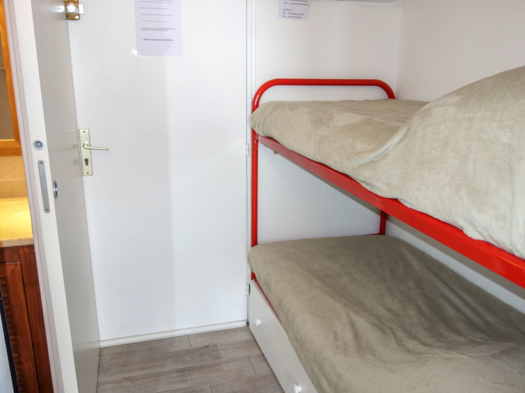 Appartement 1-kamer 20 m2 op de 2e verdieping. Licht, volledig gerenoveerd in 2018, comfortabel en mooi ingericht: hal, zonder ramen met 1 x 2 stapelbedden (80 cm, lengte 190 cm). Woon-/eetkamer met 1 2-pers divanbed (140 cm, lengte 190 cm), TV. Uitgang naar het terras. Kookhoek (afwasmachine, 2 inductiekookplaten, waterkoker, magnetron, elektrische koffiemachine). Douche/WC. Elektrische verwarming. Terras 6 m2, overdekt, op het zuidwesten gelegen. Terrasmeubelen. Uitzicht op zee. Ter beschikking: Internet (Internet (WiFi), extra). Parkeerplaats nr. 811. TV alleen FR. Rookmelders. 83112 000212 W1