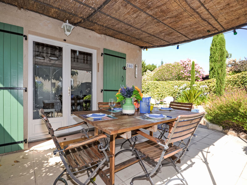 Vakantiedorp "Val d'Alpilles". 103 huizen in de woning. Voor medegebruik: openluchtzwembad (10 x 5 m, seizoensgebonden beschikbaarheid: 15.Mei. en 15.Sep. openingstijden zwembad: 09:00-19:00). Douche/WC bij het zwembad, tennisbaan, jeu de boules, onderhoud zwembad door de eigenaar/tuinman. Voor alleengebruik: kleine, verzorgde tuin 150 m2 (omheind), parkeerplaats nr. 103 bij het huis op 50 m. Winkel, levensmiddelenwinkel 300 m, supermarkt 500 m, restaurant 300 m, bakkerij 350 m, bushalte "Le Stade" 750 m. Attracties in de buurt: Maussane Les Alpilles 300 m, Les Baux de Provence 2 km, Saint Rémy de Provence 10 km, Aix en Provence 70 km. Auto noodzakelijk.
