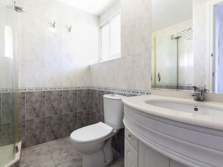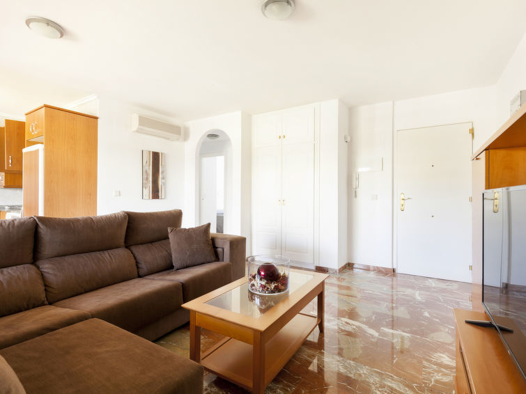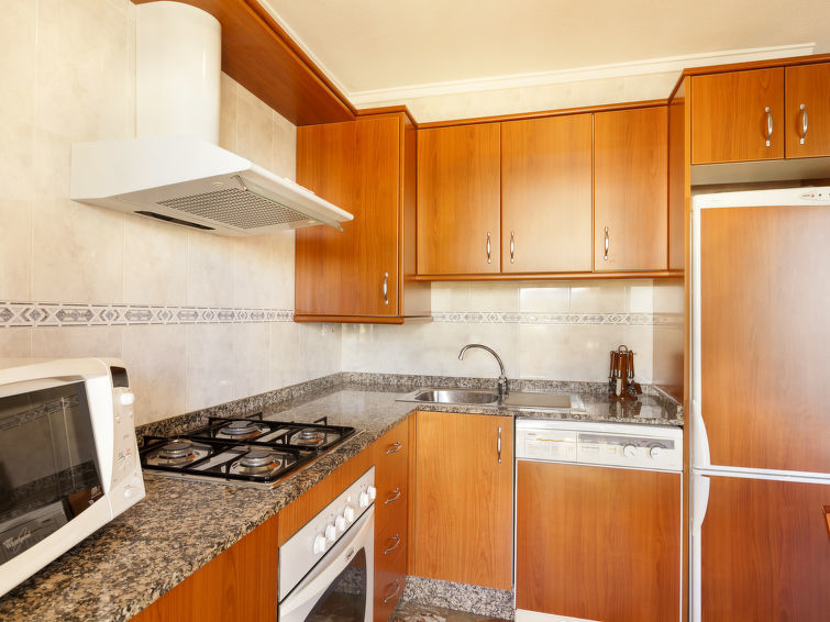 "Cascadas de la Marina", appartement 3-kamers 63 m2 op de 3e verdieping. Comfortabel en modern ingericht: woon-/eetkamer met Sat-TV, stereo-installatie, air-conditioning en heteluchtverwarming. Uitgang naar het terras. 1 2-pers. kamer met 2 bedden (90 cm, lengte 190 cm), air-conditioning en heteluchtverwarming. 1 kamer met 1 2-pers bed (150 cm, lengte 190 cm), air-conditioning en heteluchtverwarming. Open keuken (oven, magnetron, diepvriezer). Douche/WC. Groot terras 45 m2, terras 16 m2, overdekt. Terrasmeubelen, ligstoelen. Uitzicht op zee, het zwembad en de tuin. Ter beschikking: wasmachine, strijkijzer. Internet (WiFi, gratis). Garage nr. 51. AT-427810-A